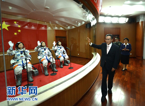 6月16日,中共中央政治局常委、全國人大常委會委員長吳邦國在酒泉衛(wèi)星發(fā)射中心觀看神舟九號載人飛船發(fā)射。這是吳邦國向即將出征的航天員景海鵬、劉旺、劉洋揮手致意。 新華社記者 劉建生 攝