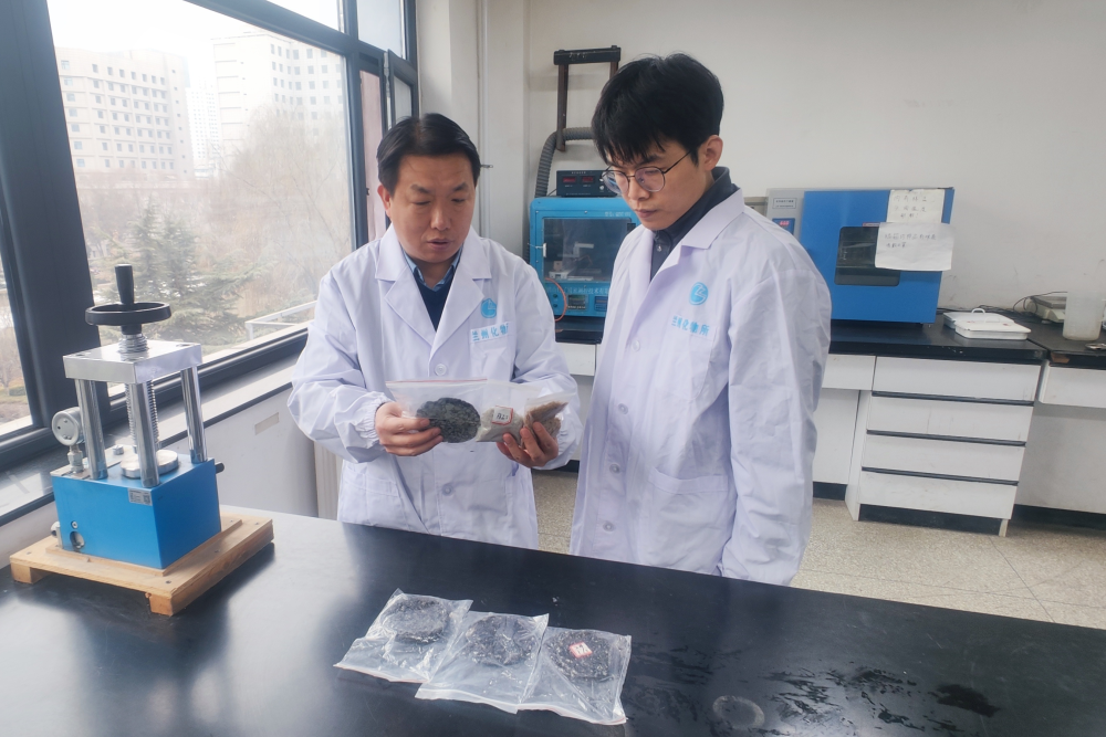 2024年12月26日,唐志誠研究員(左一)在中國科學(xué)院蘭州化學(xué)物理研究所實(shí)驗(yàn)室里向團(tuán)隊(duì)成員介紹處理后的風(fēng)機(jī)葉片材料。受訪者供圖