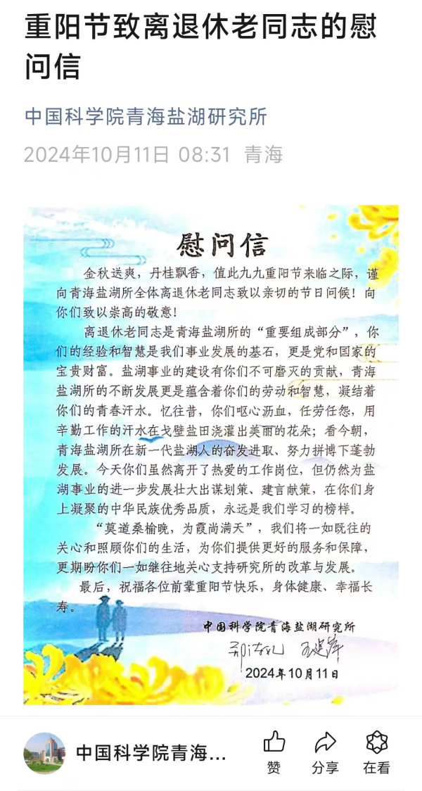 10月11日,在一年一度的重陽佳節(jié)來臨之際,為弘揚(yáng)中華民族尊老、敬老、愛老、助老的優(yōu)良傳統(tǒng),中國科學(xué)院青海鹽湖研究所組織開展了重陽節(jié)關(guān)愛慰問系列活動(dòng),讓離退休職工在屬于他們的節(jié)日里感受組織的關(guān)心和節(jié)日的快樂。