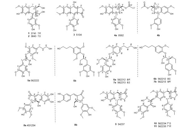 從水母雪蓮花全草中分離鑒定200余個(gè)化合物(新化合物25個(gè)),主要為萜類、木脂素類、黃酮類、苯丙素類、生物堿類。分離的25個(gè)新化合物,包含8個(gè)新萜和17個(gè)木脂素。8個(gè)萜類新化合物,除一個(gè)為單萜外,其余均為倍半萜類化合物。包括2個(gè)罕見的botryane骨架型倍半萜和5個(gè)甲基環(huán)己烯型倍半萜及其降碳倍半萜。實(shí)驗(yàn)采用了[Mo2(OAc)4]化學(xué)反應(yīng)方法確定了化合物柔性側(cè)鏈上羥基的絕對構(gòu)型,并采用計(jì)算ECD的方法對環(huán)上羥基的構(gòu)型進(jìn)行確定。17個(gè)新木脂素化合物,包括5對對映異構(gòu)體和7個(gè)新單體化合物。實(shí)驗(yàn)選用DAICEL手性拆分色譜柱,采用LC-CD技術(shù),對對映異構(gòu)體類木脂素新化合物進(jìn)行手性拆分和在線CD測定,得到5組近似鏡像CD圖。