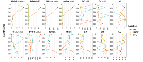 圖1 海岸凍土帶三個(gè)熱融湖塘湖相沉積層的孔隙水化學(xué)特征。 縱軸表示從沉積層表面開(kāi)始的深度。 其中LG和LNPF為淡水環(huán)境的熱融湖塘,PFL為熱融瀉湖。其沉積層表層分別位于湖面以下 510、560 和 310cm處