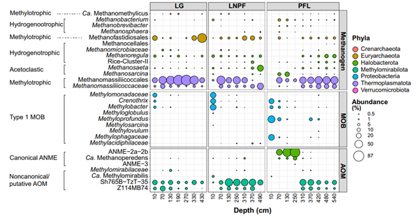 圖2 氣泡圖顯示熱融湖塘(LG 和LNPF)和瀉湖(PFL)中產(chǎn)甲烷古菌(Methanogen),需氧甲烷氧化細(xì)菌(MOB)和厭氧甲烷氧化古菌(AOM)的組成特征