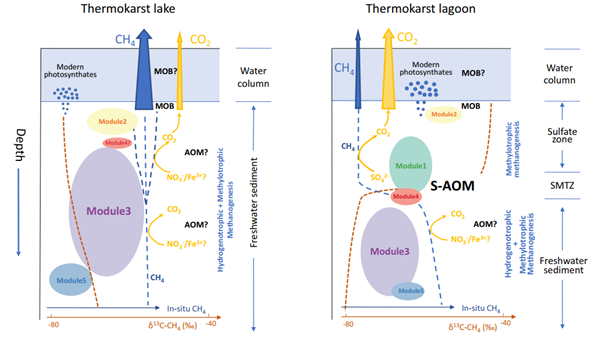 圖3 左圖顯示淡水熱融湖泊中甲烷循環(huán)群落和過(guò)程的分層分布,右圖顯示在熱融湖泊變成熱融瀉湖后群落和甲烷周轉(zhuǎn)途徑的重組特征。 所有模塊都包含嗜氫甲基營(yíng)養(yǎng)型產(chǎn)甲烷菌。 模塊 Module 1 僅存在于瀉湖的富含硫酸鹽的咸水層,由源自海洋的厭氧甲烷氧化古菌( AOM)為核心組分。 模塊 4 的 AOM 是海洋和湖泊過(guò)渡層中常出現(xiàn)的組分。 模塊 2、模塊 3 和模塊 5 在熱融湖塘和瀉湖中均可見(jiàn),由不同類型的產(chǎn)甲烷菌、需氧甲烷氧化細(xì)菌(MOB) 和厭氧甲烷氧化古菌( AOM) 組成