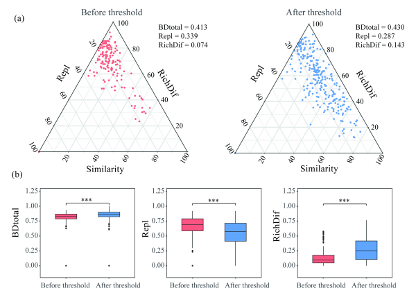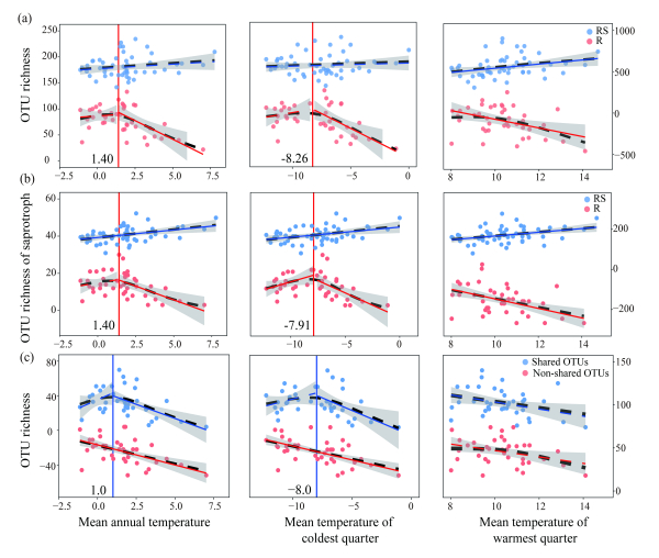 中國科學(xué)院西北高原生物研究所的科研人員以青藏高原特有植物山莨菪為研究對象,沿緯度梯度采集了山莨菪植物根及其根際土壤樣品,測定了真菌ITS2區(qū),分析了真菌組成及多樣性。研究發(fā)現(xiàn),山莨菪根內(nèi)生真菌多樣性地理分布格局受到溫度的非線性控制,且存在多個影響植物根內(nèi)生真菌α多樣性的溫度閾值,如1.40℃的年平均溫度和-8.26℃的最冷季平均溫度。當(dāng)溫度跨過閾值時真菌多樣性將急劇下降,而且該現(xiàn)象在干冷季節(jié)更為敏感。然而,根際土壤真菌與根內(nèi)生真菌不同,根際土壤真菌α多樣性與溫度呈線性關(guān)系。根與根際土壤共有真菌的α多樣性對溫度升高的響應(yīng)也存在多個溫度閾值。這種不同步性表明溫度可能調(diào)控土壤真菌進(jìn)入根組織定植的過程。此外,發(fā)現(xiàn)溫度閾值對根內(nèi)生真菌β多樣性存在顯著影響,當(dāng)溫差跨越2.2℃時,物種替換急劇減少,物種豐富度差異急劇增加。本研究表明溫度閾值驅(qū)動植物內(nèi)生真菌地理學(xué)分布格局,為解析全球變化下宿主-微生物相互作用提供了一個研究框架。