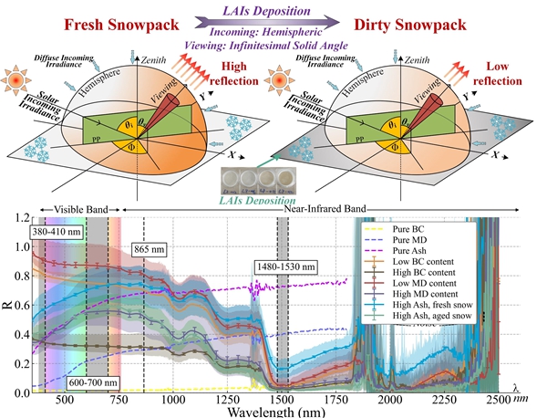 積雪中不同吸光物質(zhì)(Light-absorbing Impurities, LAIs)對積雪的光譜特征有重要影響,特別對積雪的反照率影響較大,進而影響地氣能量平衡,間接導(dǎo)致氣候變化。但積雪中不同類型、不同含量吸光物質(zhì)對積雪光譜特征的定量影響研究較少,限制了積雪污染物的定量遙感反演。