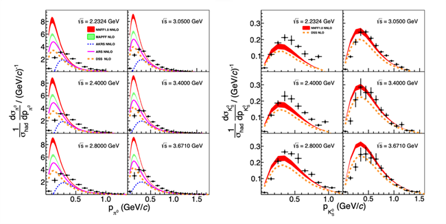 在本項工作中,利用北京譜儀BESIII數(shù)據(jù),團隊精確測量了中性pion和Kaon介子單舉產(chǎn)生微分截面,最高精度達(dá)4%, 僅為現(xiàn)有實驗數(shù)據(jù)誤差的五分之一?;诂F(xiàn)有一系列碎裂函數(shù)的理論計算均不能很好地描述實驗結(jié)果。因此,該能區(qū)的實驗測量為碎裂函數(shù)及強子化過程的研究提供了精確的實驗數(shù)據(jù)。