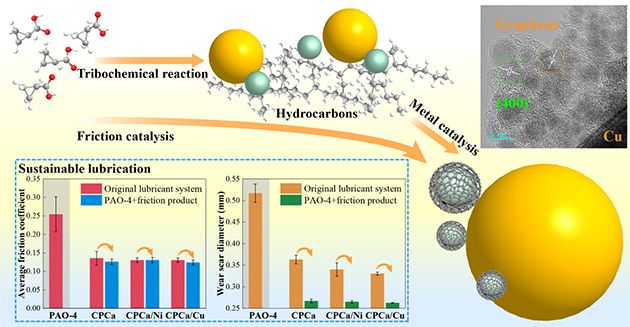 為促使界面間碳基摩擦膜的快速形成,研究人員選取吸附能和表面能較高的活性碳源小分子環(huán)丙甲酸(CPCa)與金屬粒子復(fù)合引入基礎(chǔ)油,CPCa在熱催化-力剪切作用下快速發(fā)生脫氫斷鍵向石墨化轉(zhuǎn)變,生成了含有石墨烯的碳基摩擦膜。同時(shí),石墨化產(chǎn)物促進(jìn)了潤(rùn)滑體系的可持續(xù)潤(rùn)滑效應(yīng),提升了體系的潤(rùn)滑壽命。相關(guān)成果發(fā)表在ACS Sustainable Chemistry & Engineering(2023, 11(6): 2238-2248, DOI: 10.1021/acssuschemeng.2c05639)上,并入選當(dāng)期補(bǔ)充封面文章(Supplementary Cover Article)。