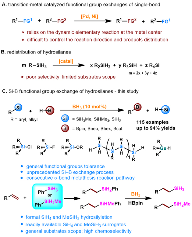 圖1.基于單鍵的官能團交換反應(yīng)和硼烷催化Si–B官能團交換反應(yīng)