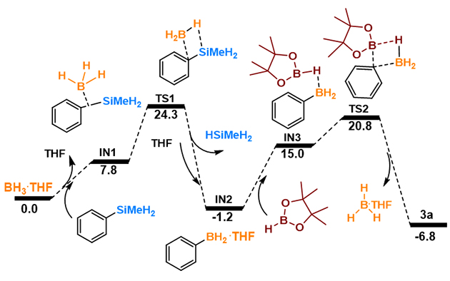 結(jié)合相關(guān)控制實驗、DFT計算和相關(guān)文獻報道,研究人員提出了該反應(yīng)的可能機理(圖3),PhMeSiH2與BH3·THF接近形成中間體IN1,經(jīng)過中間過渡態(tài)TS1發(fā)生C–Si/B–H鍵的σ復(fù)分解反應(yīng)生成IN2中間體PhBH2·THF,IN2中間體與HBPin結(jié)合生成中間體IN3,經(jīng)過中間過渡態(tài)TS2發(fā)生C–B/B–H鍵的σ復(fù)分解反應(yīng)生成最終產(chǎn)物3a,同時BH3·THF再生,完成催化循環(huán)。