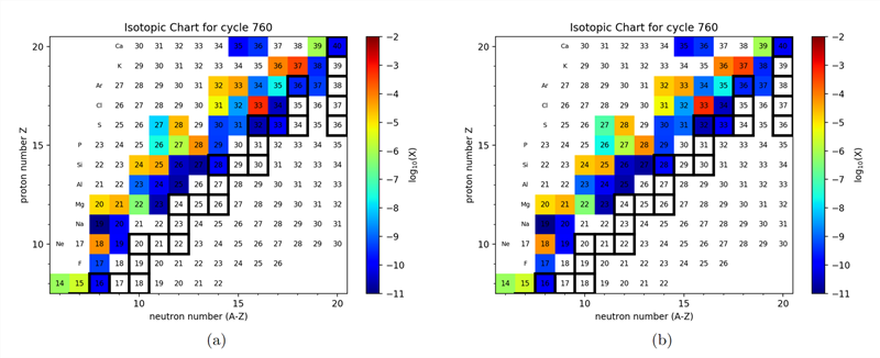 圖1:rp-過程結(jié)束后核素豐度分布圖。左圖采用新的反應率,右圖采用ths8反應率。(圖源/The Astrophysical Journal)???????