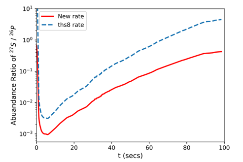 研究發(fā)現(xiàn),該反應在X-射線暴溫度區(qū)域內(nèi)由直接俘獲過程主導,且新反應率比前人使用統(tǒng)計模型得到的結(jié)果至少小一個量級。此外,核合成計算顯示,相比于使用統(tǒng)計模型給出的反應率,新反應率的采用使得rp-過程物質(zhì)主要聚集在磷-26(見圖1),并且硫-27與磷-26豐度比值減小至原來的10%(圖2), 最終導致反應灰燼中鋁-27的量下降7.1%。 ?????? ?