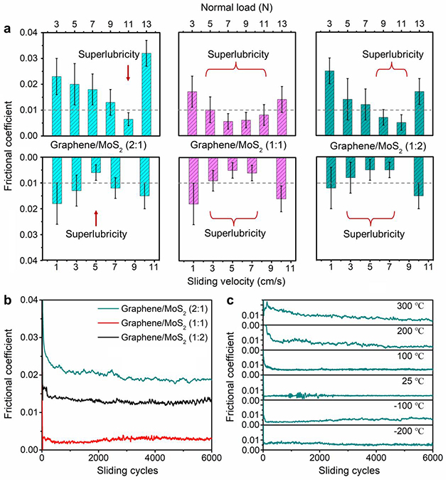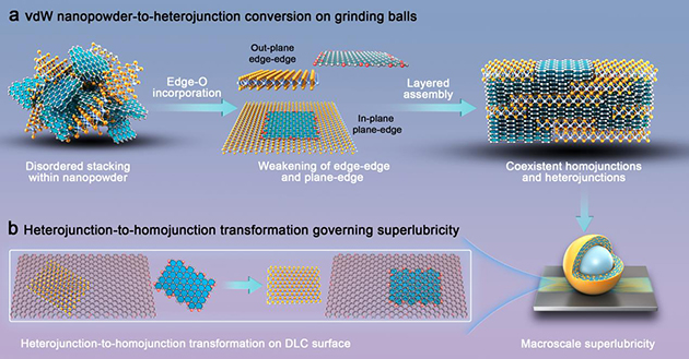 研究人員開發(fā)了一種通過摻入石墨烯邊緣氧削弱納米粉體邊緣釘扎效應(yīng)的簡易方法,實(shí)現(xiàn)了二維納米粉體到異質(zhì)結(jié)轉(zhuǎn)化,制備了由大量納米尺度同質(zhì)結(jié)和異質(zhì)結(jié)共存的材料,實(shí)現(xiàn)了載荷、速度等可調(diào)、寬溫域(-200~300°C)和宏觀尺度結(jié)構(gòu)超潤滑,揭示了異質(zhì)滑移和同質(zhì)鎖定的超滑調(diào)控機(jī)制。該研究結(jié)果對結(jié)構(gòu)超潤滑的規(guī)模放大和工程應(yīng)用具有重要意義。