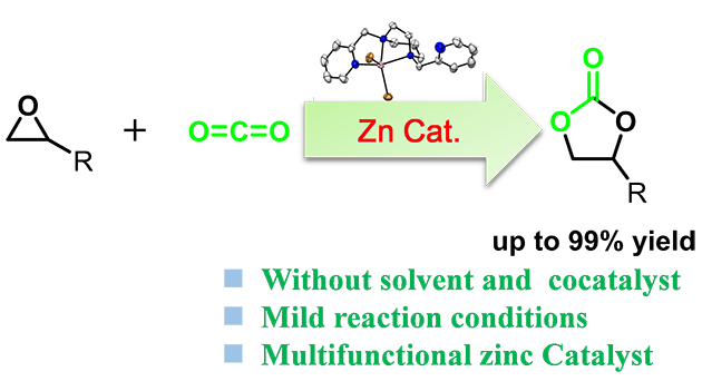 近期,該課題組進(jìn)一步拓展了非血紅素N4金屬配合物的應(yīng)用,開發(fā)了N4-Zn配合物作為多功能催化劑,實現(xiàn)了溫和條件下催化環(huán)氧化物和二氧化碳(CO2)合成環(huán)狀碳酸酯(圖1)。該反應(yīng)體系具有廣泛的底物適用性、無溶劑和助催化劑、多活性位點協(xié)調(diào)催化、手性底物構(gòu)型保持、多次循環(huán)利用等優(yōu)點,為CO2利用合成環(huán)狀碳酸酯,提供了一種新穎的催化體系。