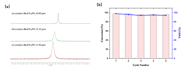 圖3 (a)配合物Zn/Et3PO的31P核磁圖譜;(b)催化劑循環(huán)使用圖