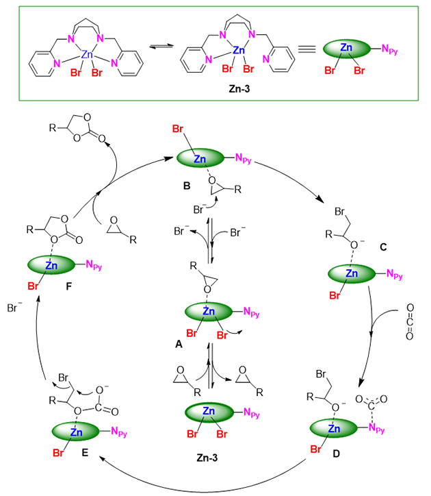 圖1 非血紅素鋅配合物催化CO2與環(huán)氧化合物環(huán)加成反應(yīng)