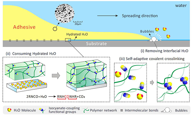 濕黏附在機械工程、海洋技術和醫(yī)療科學等領域發(fā)揮著重要作用。然而,在固-固界面含水粘接過程中,水分子的存在極易導致粘合失效,這主要是因為界面水阻礙了膠黏劑與基材之間的接觸和分子間相互作用的形成。對于界面水的去除,研究人員已進行了各種嘗試,如界面吸水、疏水排斥和擠壓,但這些方法并不能實現界面水的完全去除,很難保證界面的高性能黏附。