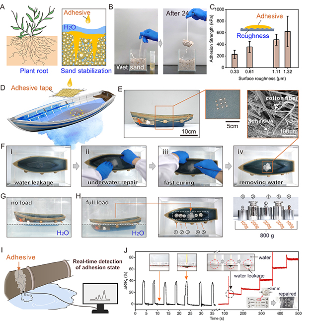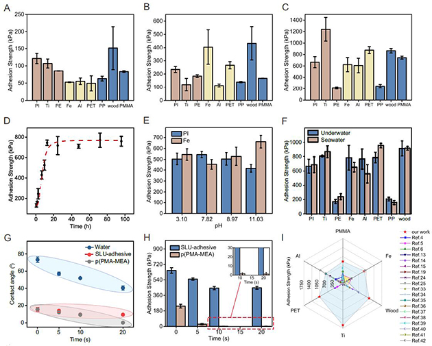 SLU-adhesive表現出優(yōu)異的水下黏附性能和廣泛的基材適用性,在淡水、海水和不同pH水體環(huán)境(pH=3至11)中,均實現了從無機到有機材料表面的高性能黏附,其峰值超過1600kPa。良好的黏附性能和無外界能量輸入的自適應增強特性,使SLU-adhesive在水下固沙、水下修復甚至黏附故障檢測方面展現出巨大的應用潛力。
