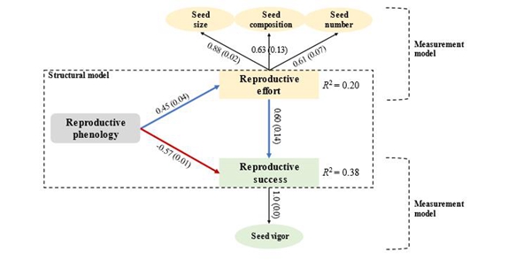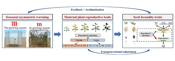 基于此,中國科學(xué)院西北生態(tài)環(huán)境資源研究院(以下簡稱西北研究院)科研人員以科爾沁沙地優(yōu)勢固沙灌木小葉錦雞兒(Caragana microphylla)為研究對象,探究了不同時段增溫對其繁殖物候和種子繁殖力的影響及差異,并從繁殖努力和繁殖成功角度分析了種子繁殖應(yīng)對季節(jié)非對稱性增溫的響應(yīng)策略(圖1)。研究發(fā)現(xiàn),繁殖物候通過提前開始、推遲結(jié)束、延長持續(xù)期和降低同步性來適應(yīng)季節(jié)非對稱性增溫(圖2),同時這種適應(yīng)分別增加和阻礙了種子的繁殖努力和成功(圖4)。繁殖物候適應(yīng)性、種子繁殖努力和成功與生長季溫度和增溫時長呈正相關(guān),而生長季前增溫對繁殖努力和成功均有負(fù)面影響(圖3-4)。該研究結(jié)果表明,增溫的季節(jié)非對稱性和持續(xù)時間,可通過調(diào)整繁殖物候模式和種子繁殖性狀來改變種子繁殖策略,其中生長季前較暖的冬季和春季降低了半干旱沙區(qū)固沙灌木小葉錦雞兒種子的繁殖力。
