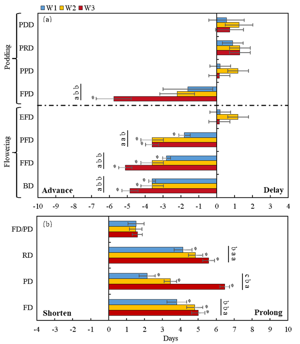 圖2 不同增溫處理下小葉錦雞兒繁殖物候各階段起始時間(a)和持續(xù)時長(b)的變化
