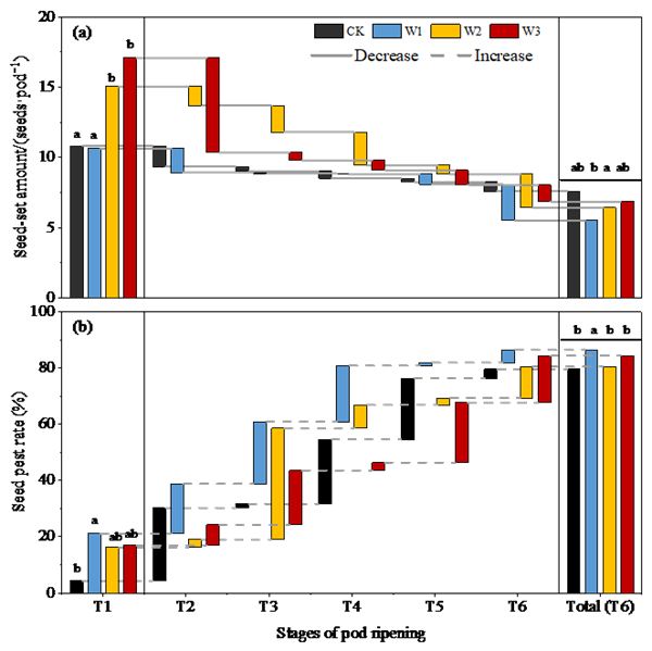 圖3 不同增溫處理下果熟期不同階段小葉錦雞兒(a)結(jié)種量和(b)蟲害率
