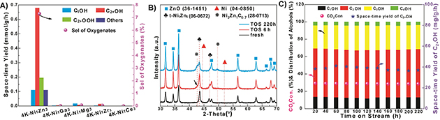 圖2.(A)篩選Ni基催化劑;(B)不同反應(yīng)時(shí)間下的XRD結(jié)果; (C)穩(wěn)定性測(cè)試