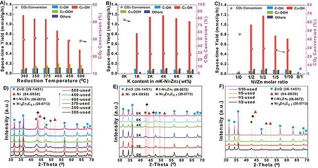 圖3.不同參數(shù)催化劑的催化性能及反應(yīng)后催化劑的XRD結(jié)果:(A)&(D) 不同催化劑還原溫度; (B)&(E)不同K負(fù)載量;(C)&(F)不同Ni/Zn摩爾比