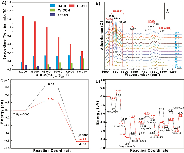 圖4.(A)不同空速條件下的催化性能; (B)原位DRIFTS監(jiān)測(cè)反應(yīng)過程;DFT模擬C-C偶聯(lián)過程(C)與*CH3COO加氫形成CH3CH2OH過程(D),