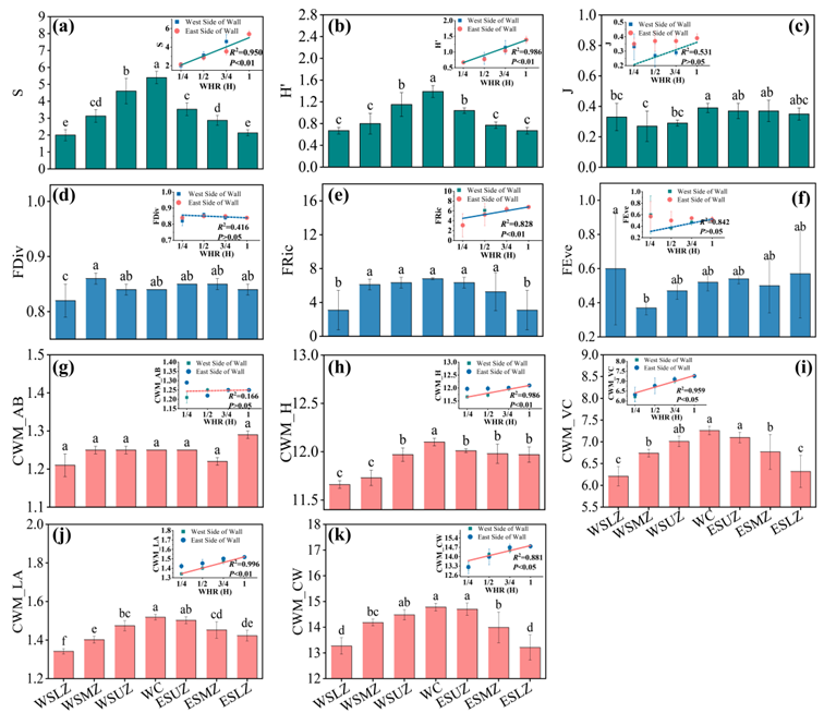 圖1 長城遺址不同微空間位置物種豐富度(a)、物種多樣性(b)、物種均勻度(c)、功能均勻度(d)、功能分化度(e)、功能豐富度(f)、群落加權(quán)平均_生物量(CWM_AB,g)、群落加權(quán)平均_株高(CWM_H,h)、群落加權(quán)平均_蓋度(CWM_VC,i)、群落加權(quán)平均_葉面積(CWM_LA,j)、群落加權(quán)平均_冠幅(CWM_CW,k)變化情況.
