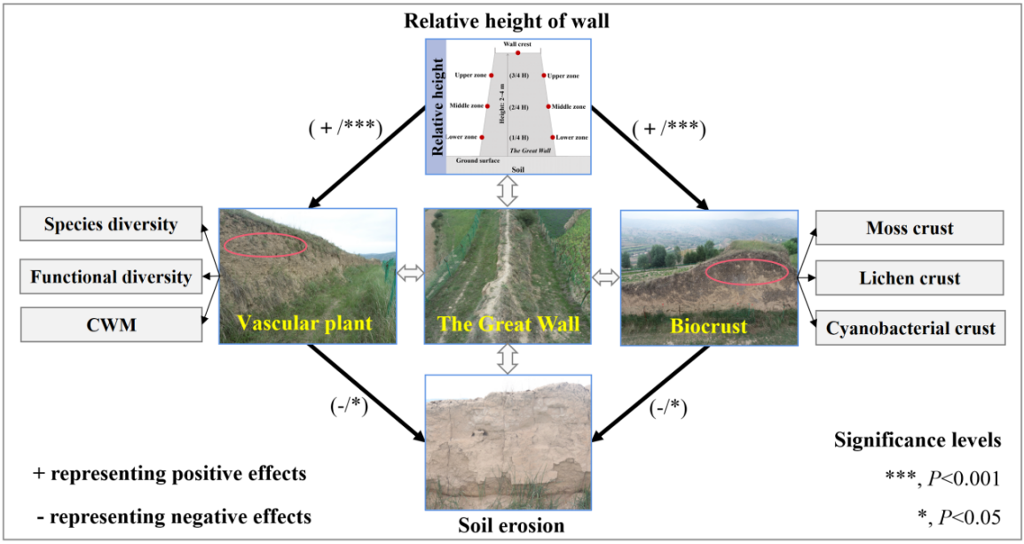 該成果以Vascular plant communities and biocrusts act as controlling factors in mitigating soil erosion on the Great Wall in a semi-humid area of Northwestern China 為題,發(fā)表于Science of the Total Environment期刊上。