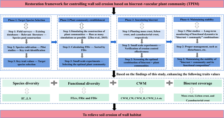 研究發(fā)現(xiàn),維管束植物物種豐富度、物種多樣性、功能豐富度、群落加權(quán)平均和苔蘚結(jié)皮蓋度由土長城遺址頂部向下部顯著降低,且與土長城兩側(cè)土體侵蝕程度呈負(fù)相關(guān)(圖1),表明土長城本體較高的區(qū)域有利于維管束植物和生物結(jié)皮的定殖和生長。同時(shí),維管束植物和生物結(jié)皮的協(xié)同作用能有效緩解遺址本體遭受風(fēng)雨侵蝕(圖2)?;诖耍芯咳藛T提出了基于生物結(jié)皮和維管束植物群落構(gòu)建目標(biāo)物種選擇、植物群落構(gòu)建、生物結(jié)皮接種和維持群落穩(wěn)定等增強(qiáng)土長城抗侵蝕的“修復(fù)框架”(圖3),為土長城遺址本體侵蝕防治提供了新思路。