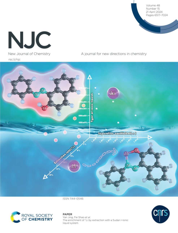中國科學院青海鹽湖研究所同位素分離與化學品精制課題組針對蘇丹Ⅰ(1-苯基偶氮-2-萘酚)萃取富集7Li分離效應低問題開展研究?;陔x子液體在鋰同位素分離體系中表現(xiàn)出優(yōu)異的協(xié)萃性能,將離子液體引入蘇丹Ⅰ體系中,構建蘇丹離子液體(Ⅰ-[HMIm][BF4])萃取體系,極大提高了蘇丹Ⅰ對7Li的分離能力。蘇丹Ⅰ與Li+是1:1進行絡合,過程中離子液體在跨界面遷移中主要起輔助作用,離子液體陰離子親水性越強,其輔助萃取作用越強,且計算表明離子液體的陰離子極有可能參與了蘇丹Ⅰ與鋰離子的配位。此研究成果在New Journal of Chemistry期刊發(fā)表封面學術論文一篇,SCI收錄。