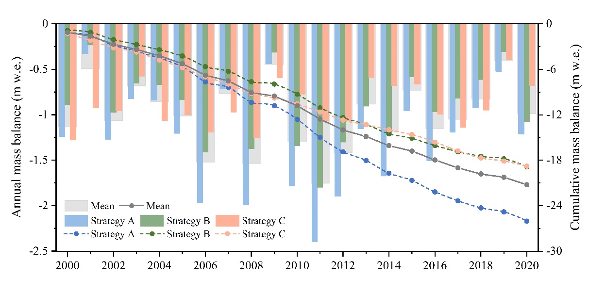 該成果以Historical reconstruction of glacier mass balance and its contribution to water resources in the Sawir Mountains from 2000 to 2020為題發(fā)表于Science of the Total Environment期刊上。碩士研究生余鳳臣為第一作者,王璞玉研究員為通訊作者。該研究獲國家自然科學(xué)基金、中國科學(xué)院青年創(chuàng)新促進(jìn)會優(yōu)秀會員項目、新疆第三次綜合科學(xué)考察項目和冰凍圈科學(xué)國家重點(diǎn)實(shí)驗室自主項目等聯(lián)合資助。
