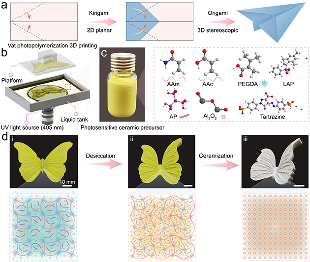 該團(tuán)隊(duì)受折紙/剪紙藝術(shù)啟發(fā),以水性無(wú)機(jī)粘結(jié)劑磷酸二氫鋁(AP)溶膠為水凝膠單體分散介質(zhì),將水凝膠單體和納米陶瓷粉體混合來(lái)制備光敏性水凝膠陶瓷漿料;利用光固化3D打印獲得具有優(yōu)異的延展性、形狀適應(yīng)性、抗疲勞性且可二次變形的水凝膠柔性骨架;依次經(jīng)過(guò)脫水干燥、低溫脫脂和高溫?zé)Y(jié)等步驟,實(shí)現(xiàn)了具有超低收縮、高陶瓷產(chǎn)率和形狀保真度的懸空大跨度陶瓷結(jié)構(gòu)(圖1)。設(shè)計(jì)的柔性水凝膠基陶瓷前驅(qū)體能夠?qū)崿F(xiàn)從平面形狀到3D立體結(jié)構(gòu)的轉(zhuǎn)變,突破了傳統(tǒng)硬質(zhì)/脆性陶瓷前驅(qū)體來(lái)制造復(fù)雜陶瓷結(jié)構(gòu)的局限。
