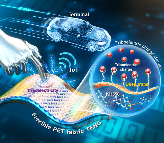 摩擦起電過程中產(chǎn)生的電荷會(huì)瞬時(shí)存儲在電介質(zhì)表面,進(jìn)而被兩種不同類型的陷阱(淺陷阱和深陷阱)捕獲。其中,淺陷阱中的電荷容易逸出,優(yōu)先耗散到環(huán)境中,而深陷阱中的電荷則因?yàn)闃O難逸出,可長期儲存。因此,影響摩擦層電荷耗散率的關(guān)鍵因素是陷阱捕獲電荷和被捕獲電荷的逃逸能力。基于此,該團(tuán)隊(duì)通過系統(tǒng)研究,揭示了載流子深陷阱在摩擦電荷存儲中的機(jī)制,通過分子自組裝技術(shù)在織物摩擦層界面構(gòu)建載流子深陷阱的方式增加TENG的電輸出,將該織物TENG用于物聯(lián)網(wǎng)可穿戴電子設(shè)備的電源模塊,實(shí)現(xiàn)了對機(jī)械運(yùn)動(dòng)的穩(wěn)定控制。相關(guān)研究成果發(fā)表在Advanced Materials(2024,2303389)上。