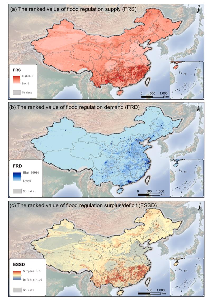 FRESF工具箱2號(hào)模塊的示例輸出,空間明確地繪制了我國(guó)2020年洪水調(diào)蓄生態(tài)系統(tǒng)服務(wù)的供給 (a)、需求?。╞) 和赤字?。╟)