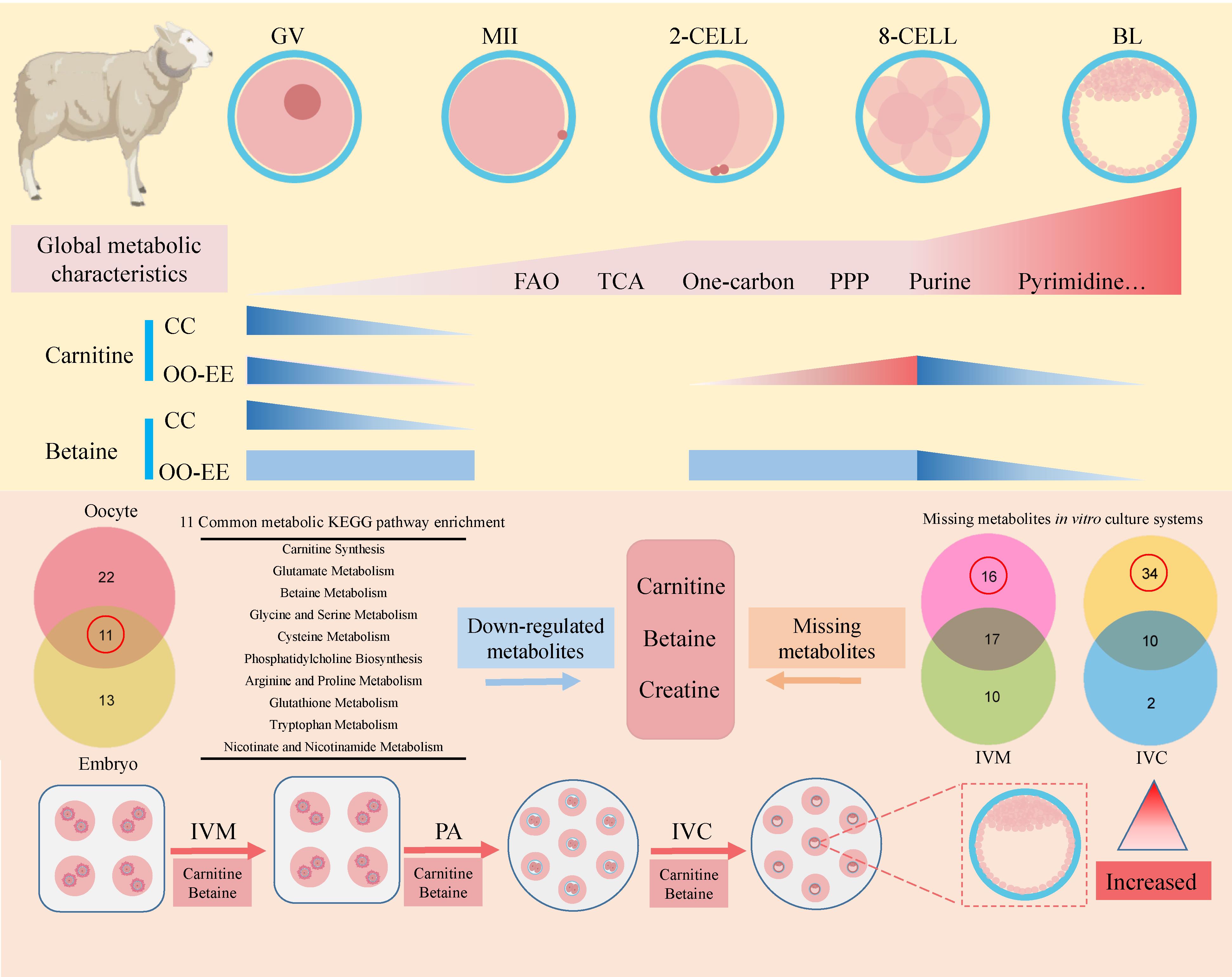 中國(guó)科學(xué)院西北高原生物研究所動(dòng)物生態(tài)與資源保護(hù)研究團(tuán)隊(duì)與四川農(nóng)業(yè)大學(xué)動(dòng)物科技學(xué)院團(tuán)隊(duì)合作,通過(guò)利用超靈敏微量代謝組學(xué)技術(shù)和單細(xì)胞轉(zhuǎn)錄組學(xué)技術(shù),對(duì)綿羊卵母細(xì)胞體外成熟及早期胚胎體外發(fā)育的代謝特征進(jìn)行了解析,發(fā)現(xiàn):從GV期卵母細(xì)胞至2-細(xì)胞胚胎階段整體代謝水平呈上升趨勢(shì),為促進(jìn)卵母細(xì)胞成熟和合子發(fā)育提供了必要的代謝底物;而在2-細(xì)胞胚胎至8細(xì)胞胚胎階段,整體代謝表現(xiàn)出安靜狀態(tài),有助于減少氧化應(yīng)激對(duì)細(xì)胞的損傷;在8-細(xì)胞胚胎至囊胚階段,整體代謝水平又明顯增加,為早期囊胚的形成、增殖分化以及表觀修飾過(guò)程提供能量和所需的代謝底物。同時(shí),鑒定出肉毒堿、甜菜堿和肌酸為該體外培養(yǎng)系統(tǒng)所缺失的關(guān)鍵代謝物。進(jìn)一步研究發(fā)現(xiàn),肉毒堿可促進(jìn)綿羊卵母細(xì)胞脂肪酸氧化,并降低脂質(zhì)含量和脂質(zhì)過(guò)氧化水平,同時(shí)還可以調(diào)節(jié)紡錘體形態(tài)。而甜菜堿則具有調(diào)節(jié)綿羊早期胚胎發(fā)育過(guò)程中滲透壓應(yīng)激和甲基化修飾的作用。當(dāng)聯(lián)合肉毒堿與甜菜堿添加至體外培養(yǎng)體系時(shí),顯著提高了綿羊卵母細(xì)胞的囊胚發(fā)育率。該研究結(jié)果為提高卵母細(xì)胞成熟和胚胎培養(yǎng)提供了新的視角。