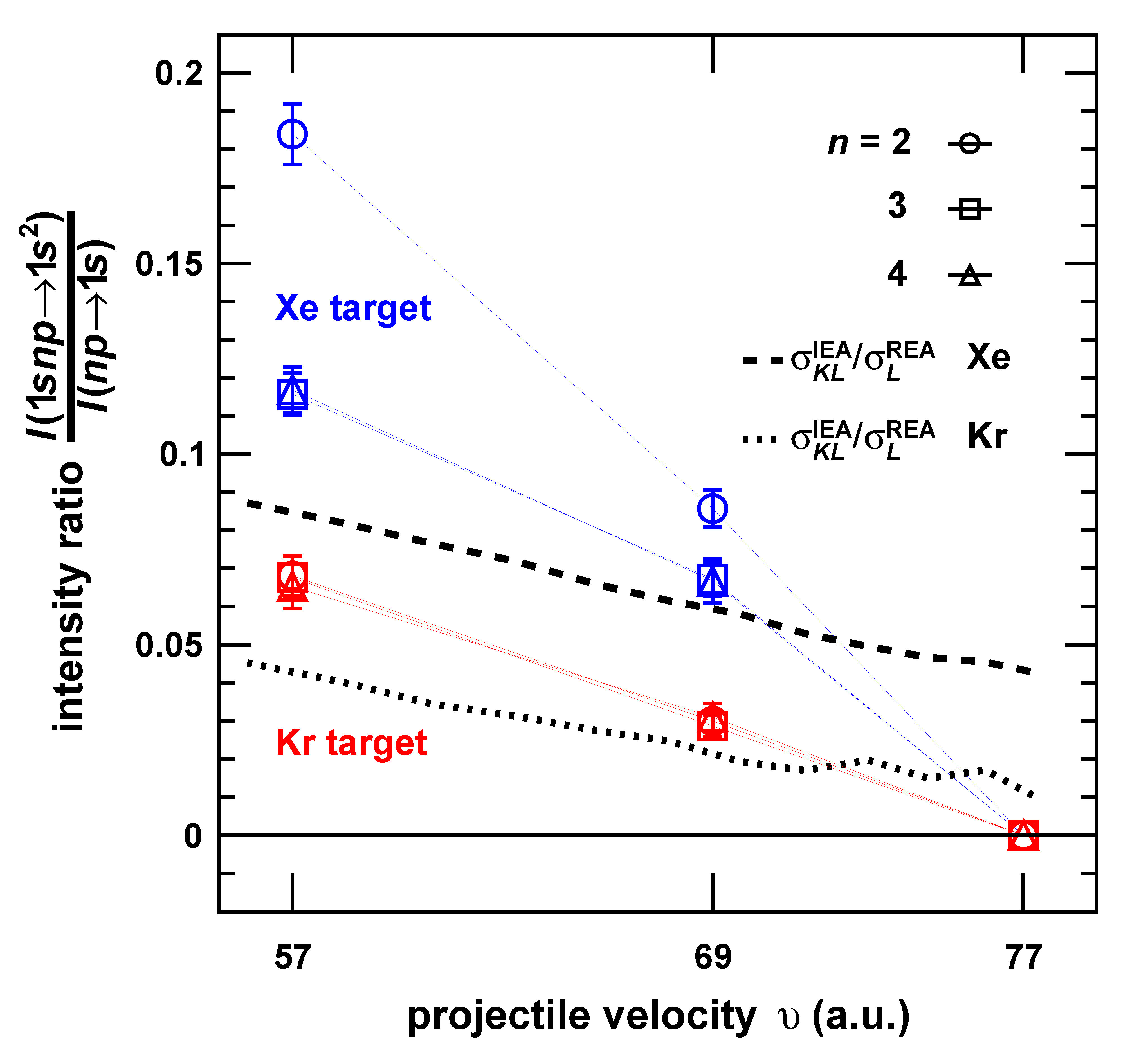 近代物理所原子分子譜學(xué)研究團(tuán)隊(duì)利用蘭州重離子加速器冷卻儲(chǔ)存環(huán)(HIRFL-CSR),開展了百MeV/u能區(qū)Xe54++Xe對(duì)稱碰撞實(shí)驗(yàn)研究。在“能級(jí)匹配”和“速度匹配”條件同時(shí)滿足時(shí),團(tuán)隊(duì)發(fā)現(xiàn)共振電子俘獲在非輻射雙電子俘獲(NRDC)過(guò)程中起重要作用,引起關(guān)聯(lián)俘獲,此時(shí)獨(dú)立電子近似不再成立。與之相反,Xe54++Kr碰撞中的NRDC過(guò)程是兩個(gè)獨(dú)立的單俘獲。