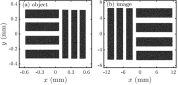 鑒于有源等離子體透鏡具有緊湊、聚焦梯度大、對(duì)稱聚焦、色差小的優(yōu)勢(shì),科研人員將該透鏡成功應(yīng)用到高能電子成像中。從高能電子束在透鏡中的傳輸矩陣出發(fā),科研人員設(shè)計(jì)了一個(gè)總長(zhǎng)為44.87cm、放大倍數(shù)為20的高能電子成像系統(tǒng),其點(diǎn)對(duì)點(diǎn)成像模擬結(jié)果如圖2所示。模擬結(jié)果表明:該系統(tǒng)的成像分辨率可以達(dá)到亞微米量級(jí),相較于基于電磁四極鐵的全長(zhǎng)為5m(放大倍數(shù)為10)的成像系統(tǒng)十分緊湊。
