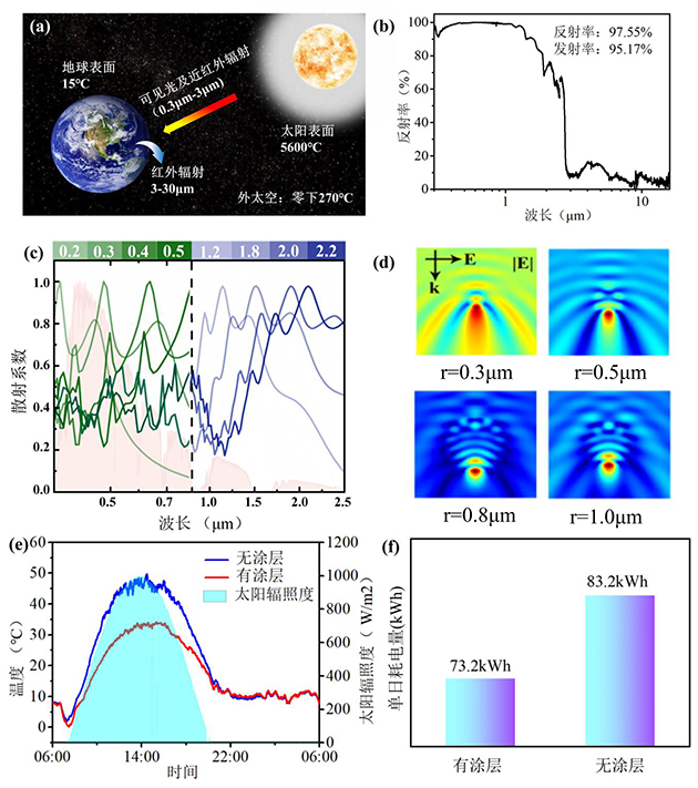 圖2.?。?/span>a) 構(gòu)建地球-太陽-外太空能源利用體系;(b) 輻射制冷涂層反射光譜;(c) 不同粒徑光學(xué)材料對0.5μm入射光的散射系數(shù)和(d) 電場分布;(e) 2024年8月18日06:00-19日06:00,太陽輻照度及儲能集裝箱表面溫度變化和(f) 空調(diào)制冷耗電量變化