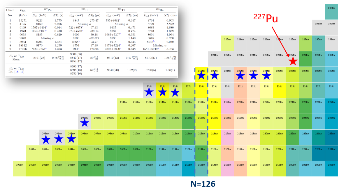 圖:實驗觀測到的9個新核素钚-227的α衰變事件以及钚-227在核素圖上的位置(紅色五星)。藍(lán)色五星標(biāo)記的是近代物理所團(tuán)隊此前合成的部分新核素。(圖/楊華彬)