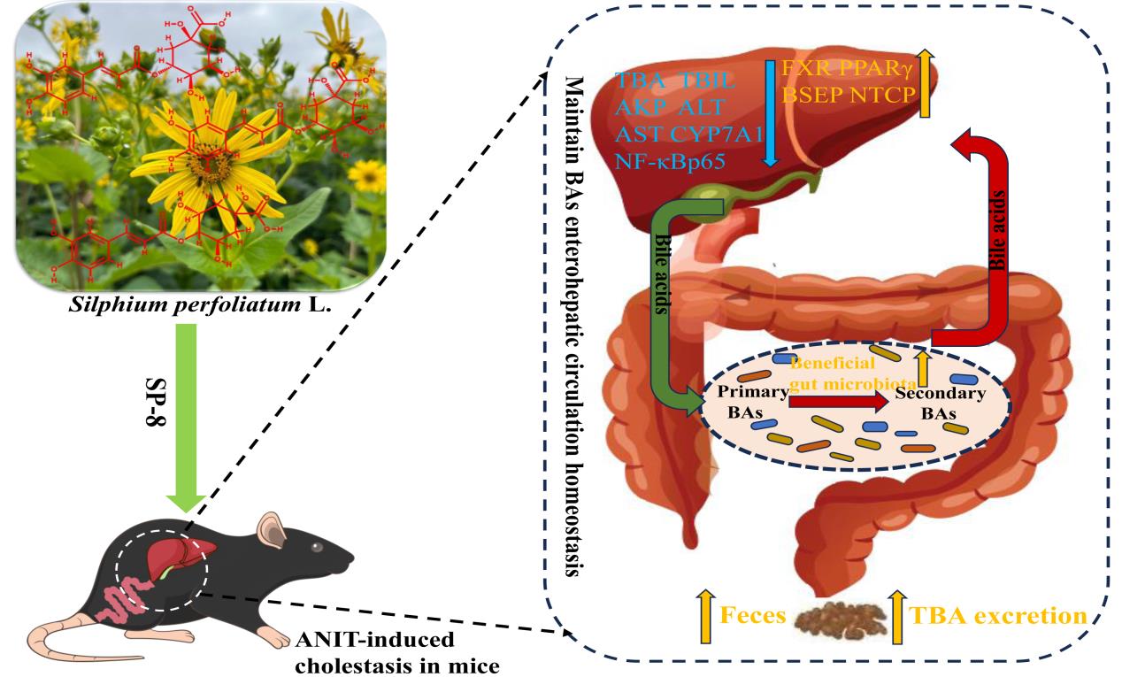 中國科學院西北高原生物研究所高原藥用資源生態(tài)保護與繁育研究團隊從一種傳統(tǒng)藥材中篩選得到咖啡??鼘幩峄钚越M份,對CLD具有顯著的治療效果。該組份不僅能夠通過調(diào)控FXR信號通路,減少BAs的合成,而且能夠通過促進BAs的肝腸循化,加速有害次級膽汁酸通過糞便排出體外,同時具有極強的抗炎活性,對膽汁淤積引起的肝臟損傷具有極強的保護和治療作用。該研究全面證實了咖啡??鼘幩峄钚越M份對膽汁淤積癥的治療效果并闡明了其作用機制,證實該組份具有很好的藥物開發(fā)潛力。