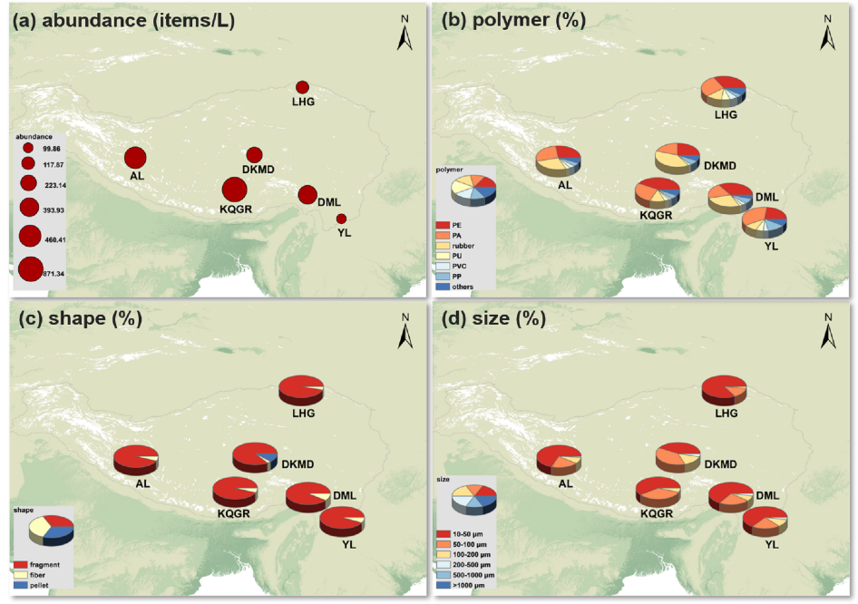 圖1 青藏高原典型冰川雪坑中微塑料的特征。其中:(a) 微塑料豐度,(b) 微塑料聚合物成分,(c) 微塑料形狀,(d) 微塑料尺寸分布。(YL-白水河1號冰川、DML-德姆拉冰川、KQGR-闊瓊崗日冰川、AL-昂龍冰川、DKMD-冬克瑪?shù)妆āHG-老虎溝12號冰川)。(Wang Z et al.,2024)