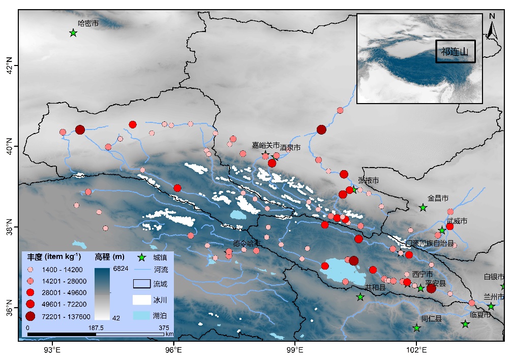 圖2 青藏高原祁連山地區(qū)以及典型流域表土中微塑料豐度分布圖?。↘ang Q et al.,2024a,2024b)