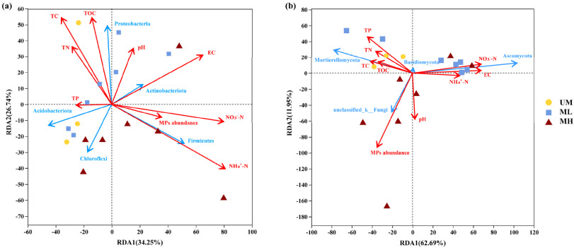 高通量測序分析表明,塑料圈中的α多樣性(Chao1和香農(nóng)指數(shù))低于土壤中的α多樣性,且隨土壤中微塑料豐度的變化而顯著不同。隨著微塑料豐度的增加,土壤中有機質(zhì)降解類群和光自養(yǎng)類群的比例也隨之增加,并顯示在塑料圈中富集。功能預(yù)測進一步表明,微塑料的豐度影響了土壤的潛在功能,如與碳和氮循環(huán)相關(guān)的代謝途徑。與土壤環(huán)境相比,塑料圈中與有機物降解相關(guān)的功能豐度較高,且塑料圈的潛在健康風險更高。根據(jù)冗余(RDA)分析,可以確定環(huán)境理化性質(zhì)和微塑料豐度對真菌群落的影響大于對細菌群落的影響(圖3)。這表明,微塑料豐度會影響微生物多樣性組成,并可能影響土壤生態(tài)系統(tǒng)的整體性能。