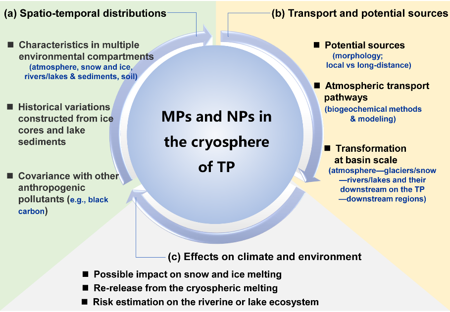 微塑料在雪冰、水體、土壤、沉積物、大氣等環(huán)境中廣泛分布,被認為是全球重要新污染物之一。青藏高原冰凍圈地區(qū)遠離人類活動密集區(qū),是研究污染物來源、傳輸以及影響的天然實驗室。開展青藏高原冰凍圈地區(qū)不同環(huán)境介質(zhì)中微塑料分布特征以及環(huán)境效應(yīng)的研究,能夠提升對微塑料污染全球影響的認識。
