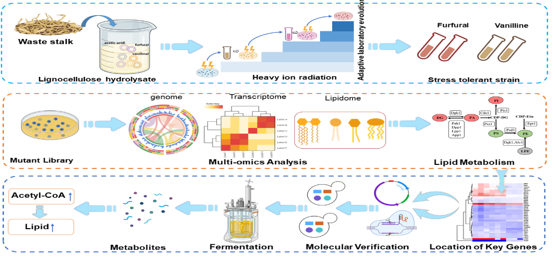 基于此現(xiàn)狀,科研人員利用蘭州重離子加速器(HIRFL)對(duì)目標(biāo)突變體實(shí)施多輪輻射,結(jié)合ALE技術(shù)提高了酵母的抗逆性和耐受性,因此獲得了適應(yīng)性更強(qiáng)的底盤(pán)細(xì)胞。再通過(guò)多組學(xué)聯(lián)合分析方法識(shí)別出與其發(fā)酵性能相關(guān)的重要基因,利用基因編輯技術(shù)對(duì)代謝通路進(jìn)行精準(zhǔn)優(yōu)化,著重優(yōu)化了核心代謝中間產(chǎn)物的代謝通量,使乙酰輔酶A水平較之前提高了17.10%,從而顯著提高了酵母在合成脂類(lèi)和其他高附加值化合物方面的產(chǎn)量。