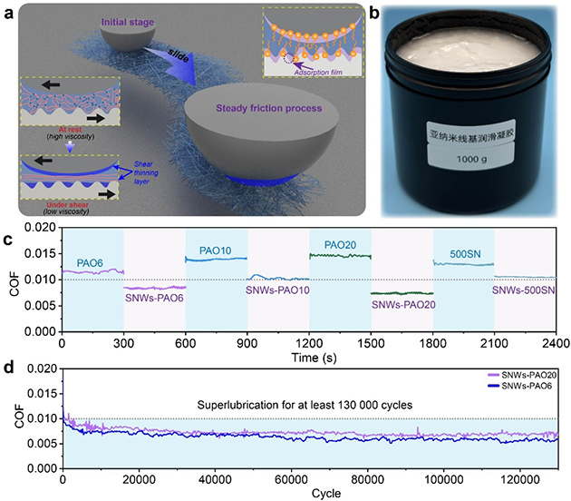 研究人員還利用剪切變稀的亞納米線材料的三維網(wǎng)絡(luò)結(jié)構(gòu),實(shí)現(xiàn)了多種基礎(chǔ)油的限域,發(fā)展了一系列半固態(tài)凝膠潤(rùn)滑劑(圖2),進(jìn)一步提高了多種基礎(chǔ)油的潤(rùn)滑性能,并在超過13萬次摩擦周期內(nèi)保持穩(wěn)定,展現(xiàn)其長(zhǎng)期應(yīng)用的潛力。最為關(guān)鍵的是,通過在實(shí)驗(yàn)室中擴(kuò)大原料比例,可成功制備千克級(jí)產(chǎn)品,展現(xiàn)出其在工業(yè)應(yīng)用中的潛力。除此之外,基于亞納米線與PAO6潤(rùn)滑油復(fù)配制備的潤(rùn)滑劑還實(shí)現(xiàn)了鋼-鋼界面的減摩抗磨,極大提高了PAO6潤(rùn)滑油的潤(rùn)滑性能及承載性能。相關(guān)研究成果發(fā)表在ACS Nano(2024,DOI:10.1021/acsnano.4c12703)上,蘭州化物所博士生王劉程和張立強(qiáng)助理研究員為論文共同第一作者,王道愛研究員為通訊作者。