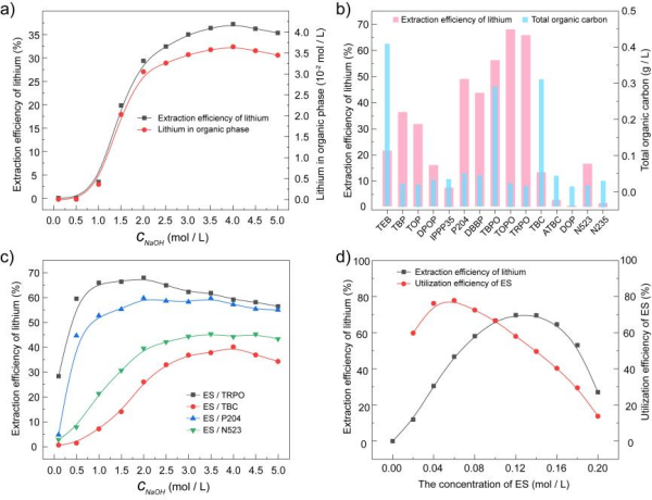 中國(guó)科學(xué)院青海鹽湖研究所研究團(tuán)隊(duì)對(duì)2-乙基己基水楊酸(ES)和三烷基磷酸氧化物(TRPO)混合萃取體系進(jìn)行了平衡、過(guò)程和機(jī)理研究。系統(tǒng)研究了影響鋰萃取的因素,如有機(jī)相組成、水相條件、萃取時(shí)間和ES萃取系統(tǒng)的酸堿耐受性。通過(guò)平衡研究,設(shè)計(jì)了從碳酸鋰母液中回收鋰的整個(gè)過(guò)程,包括萃取、洗滌、剝離和再生,并成功回收了99%的鋰,得到了含25.85 g/L鋰和0.08 g/L鈉的鋰富集溶液。研究表明,萃取過(guò)程是熱力學(xué)自發(fā)的熵增過(guò)程,在分子水平上,通過(guò)紫外-可見(jiàn)光譜(UV–Vis)、熒光光譜(Fl)、核磁共振(1H NMR)和傅里葉變換紅外光譜(FT-IR)闡明了配位機(jī)制。