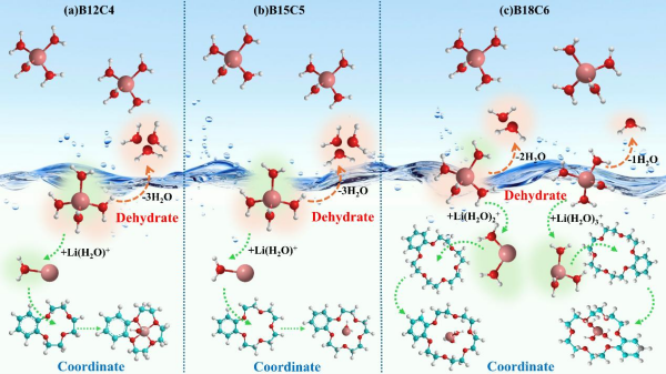 水合鋰離子與苯并-12-冠-4(B12C4)、苯并-15-冠-5(B15C5)和苯并-18-冠-6(B18C6)絡合機理示意圖