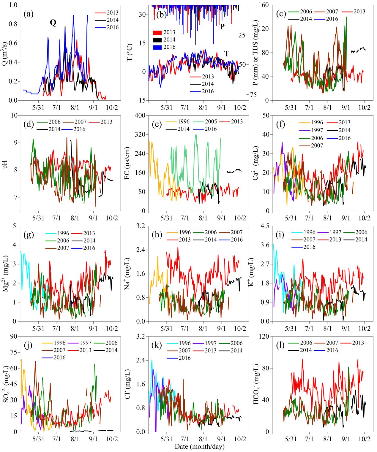 圖1. 烏魯木齊1號(hào)冰川流量、氣溫、降水、TDS、EC、pH和主離子的年際及年內(nèi)變化特征